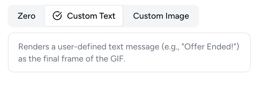 - Zero (Default): Renders a user-defined text message (e.g., “Offer Ended!”) as the final frame of the GIF.